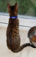 Savannahs The Savannah cat is a beautiful feline produced by breeding an African Serval to a domestic cat. This mating creates a cat with many of the striking markings of a Serval, but with a domestic temperament. The Savannah, unlike the Serval, requires no special permits, diet or care to own. The Savannah is easily trained to use the litter box and bonds well with its new family. Savannahs are reported to have a lot of dog like qualities. They can play fetch, tug-o-war, and learn tricks. Many Savannahs will actually run to the door and wait for you when they hear your car pull in the driveway. They are very smart and learn things quickly, such as what the doorknob is for. They can’t always figure out how to make it work, but they enjoy trying. Because the Savannah breed is still relatively new kittens are referred to by their generation away from the Serval. F1’s are typically 50% wild, F2’s have 25% wild blood, F3’s have 12.5% wild blood, etc. Males are sterile until the fifth generation and therefore are sold as pets only. Females are fertile and can be placed as breeders or pets. Many people are drawn to the Savannah breed because of their size. Size varies, depending on generation and sex. In general, the further away from the wild cat, the smaller they will be. However, there isn’t a large size difference between each generation. F1 males tend to fall between 20 and 27 pounds, F2 males between 17 and 25 pounds and F3 males between 15 and 23 pounds. The name Savannah refers to the African Savannah, the habitat of one of the breed's ancestors the African serval cat. The Savannah still has many of the Serval's beautiful qualities but with a more amiable temperament and better house hold habits. The Savannah is a tall lean cat with long legs and a long neck. The head is smaller in proportion to the body and longer than wide with large ears. Similar to the serval, the coat shows a spotted pattern with some bars on a golden to tawny ground color with a light colored underside. Savannah cats appear to be smaller replicas of the serval. This exotic impression is accentuated by light ocelli markings on the back of the ears as well as prominent tear duct lines in the face. Savannah males usually grow much larger than their female litter mates. Due to the graceful and long- legged appearance combined with the movement of a big cat, these striking cats are unlike any other breed. Savannah cats are friendly and sociable cats, that can get along very well with other household pets. They show their affection by eagerly giving a welcoming "head-butt" where they literally bump heads with you to say hello!. Most Savannah Cats are very outgoing and like to be petted. Because of their long legs the Savannah is an elegant jumper and like the serval often performs high leaps straight in the air. The Savannah loves water and enjoys a bath. If given the choice, a Savannah might enjoy a tub filled with water over the more usual cat games. Just like other cats Savannah cats can get along with young children and other household pets. Despite their exotic appearance, Savannah cats do not differ much from other other domestic cats in regards to care and behavior. Generally, Savannah cats can be kept like any other domestic cat but would also enjoy getting a little fresh air from a safe enclosure or a walk on a lead once in a while |